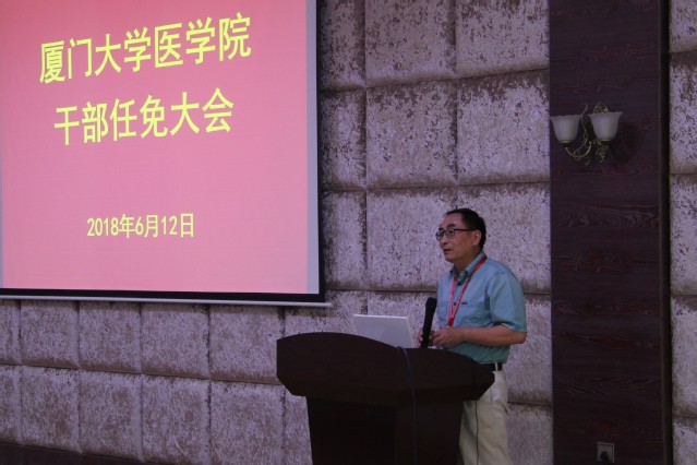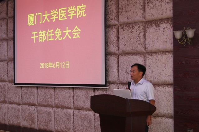 会上,李建发代表校党委、校行政宣读了关于医学院干部任免的决定:薛茂强、李炜、李文岗、钱林超任厦门大学医学院副院长。因任期届满,王彦晖、齐忠权、张业、胡天惠不再担任厦门大学医学院副院长职务。李建发说明了此次学院中层行政领导班子换届的基本情况,他代表校党委、校行政衷心感谢和肯定了上一届班子在任期内奋发进取,团结协作,以强烈的事业心和高度的政治责任感,为全力推动学院综合改革和协调发展所作出的努力,高度评价了医学院在此期间取得的各项成就,介绍了新任副院长的基本情况和工作成绩。随后,他对新一届行政班子提出五点期望: 一是加强班子建设,形成工作合力;二是坚定理想信念,把握正确方向;三是突出使命担当,推动学院发展;四是强化宗旨意识,坚持服务师生;五是严守纪律规矩,营造良好生态。特别要以深入学习十九大精神和全国高校思想政治工作会议精神为抓手,以推进学校“双一流”建设为契机,提高站位,谋划发展,真抓实干,团结带领师生员工为建设一流的医学学科、一流的医学院而继续努力。