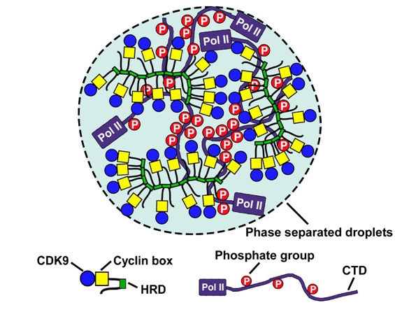 基因转录是细胞基因表达和行使正常功能必不可少的重要环节,它的异常调控往往会引发不同疾病,因此,转录调控机制及相关药物开发一直是生物医药领域研究的热点之一。人类细胞的编码基因是由RNA聚合酶II(Pol II) 负责转录,由一系列精密调控且高效的生化反应所组成。其中的一个重要反应是由转录激酶P-TEFb 对Pol II 的CTD结构域进行磷酸化高度修饰(Hyperphosphorylation),从而实现Pol II的高效转录延伸。CTD 上有许多磷酸化修饰位点,但使得P-TEFb对CTD进行高度修饰所需的识别及作用机制则尚未得到阐释。由于高效特异性的蛋白互作结构域往往具有刚性不易变的三维空间结构,我们可以将由精准蛋白互作介导的基因转录调控称为“刚性机制”。但近期的研究发现负责调控转录的蛋白常含有大量不可定义三维空间结构的片段,它们通常被称为低复杂性区域(Low Complexity Domain, LCD)或内在无序区域(Intrinsically Disordered Region, IDR)。研究表明,含有LCD/IDR的蛋白可以通过相位分离(类似日常生活中见到的油水分离)的方式聚合形成液滴状的特殊结构。这些结构可在一定的条件下从水溶液中分离出来,形成局部富集结构并极大促进存在于其中的各类生化反应的进行,同时也能与周围环境交换物质。由于LCD/IDR并不具有稳定的三维空间结构,其可塑性强,因此我们可以将由LCD/IDR介导的生物活性调控称为“柔性机制”。