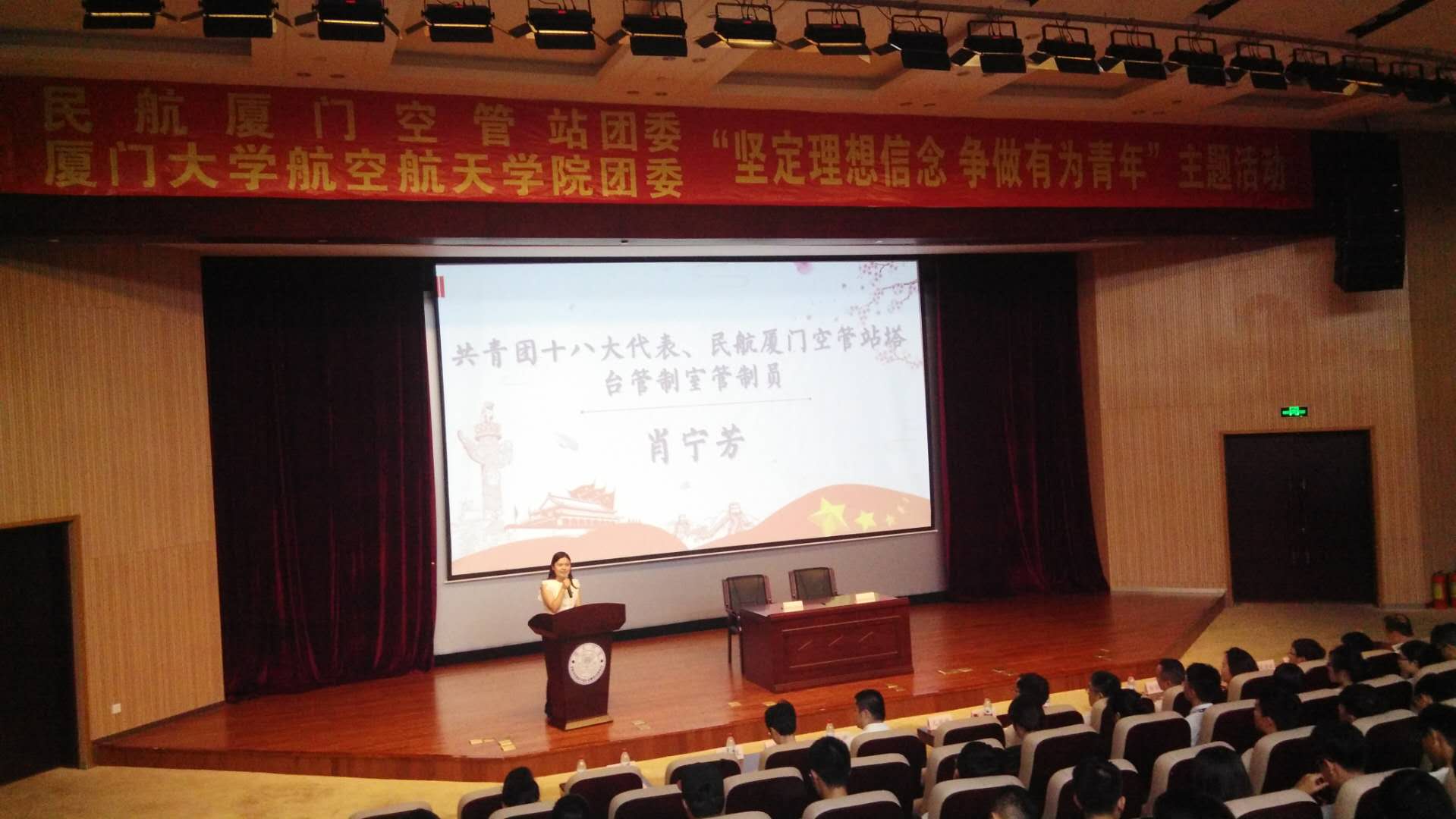 为深入学习贯彻习近平新时代中国特色社会主义思想、党的十九大精神,围绕纪念马克思诞辰200周年、五四运动 99 周年,引导青年坚定理想信念,筑牢精神支柱,推动社会主义核心价值观入脑、入心、入行,2018年5月28日下午,厦门大学航空航天学院团委携手民航厦门空管站团委在翔安校区德旺图书馆大报告厅开展共建,并联合举办“坚定理想信念·争做有为青年”主题教育活动。