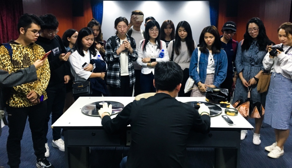 随后,师生一行来到校区图书馆八楼,参观人文学院的音像文献资料中心,了解近代以来影音技术与工业的发展历程,欣赏中心保存的珍贵音像文献资料。