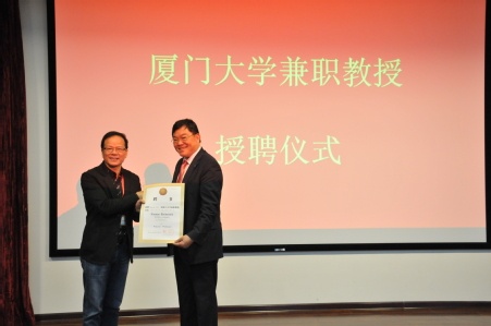 在演讲正式开始前,首先进行的是授聘仪式。生命科学学院原院长林圣彩教授为裴元虎博士颁发了兼职教授聘书。林圣彩教授称赞道,裴元虎博士是一位内心怀有精神支撑,淡定、有修养的企业家,是同学学习的榜样。
