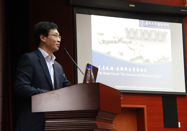 讲座开始后,蔡教授首先从本次讲座的题目切入——“未来之路”,该题目来自20年前他所读的比尔盖茨著作《未来之路》,蕴含“站在未来看现在”的意义。短短几分钟的开场,风趣幽默又不失学术的严谨,将大家的注意力引入了互联网与商务的世界。
