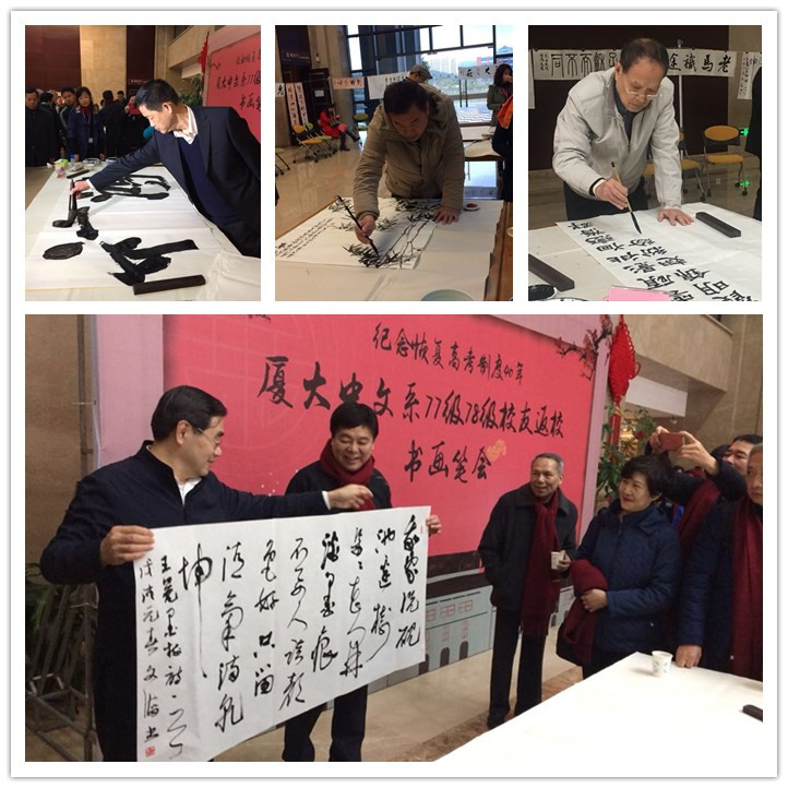 2月22日,正月初七,上班前的最后一天假期,刮着风,下着雨,有点冷,翔安校区图书馆大厅内却是一片暖融融的景象——中文77、78级的校友书画家们在挥笔泼墨,别的校友在旁饶有兴味地观摩、评论。