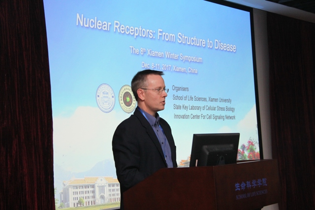 “第八届厦门冬季学术会议”由厦门大学、细胞信号网络协同创新中心、细胞应激生物学国家重点实验室联合主办。会议主题为“Nuclear Receptors: From Structure to Disease”(核受体:从结构到疾病)。核受体是配体依赖性转录因子超家族,与机体生长发育、细胞分化,以及体内许多生理、代谢过程中的基因表达调控密切相关,受到了越来越多的关注。会议邀请到美国贝勒医学院教授 Ming-Jer Tsai、美国杜克大学教授 Donald McDonnell作主题报告,还邀请到包括美国国家科学院院士 Steven Kliewer等在内的20位相关领域国际权威专家作特邀报告。会议就核受体研究领域的最新进展及应用进行交流与探讨,围绕核受体结构与药物开发 、核受体与代谢调控 、核受体与肿瘤发展 、核受体与器官发育和疾病等议题展开讨论。来自美国、加拿大等境内外高校和研究机构共180余名代表参加了会议。