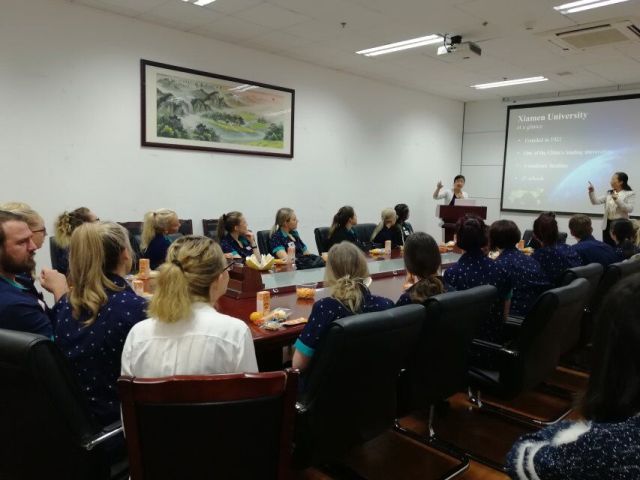 当日上午,交流团一行20人来到我校。整洁漂亮的校园,宽敞明亮的教室,高大宏伟的嘉庚风格式建筑,让从黄金海岸远道而来的学生们倍感新鲜。叶本兰教授为远道而来的朋友们简要介绍了厦门大学的地理位置、校区分布及校史校情。朱杰敏老师介绍了护理系的创办历程、课程建设及发展规划情况。沈曲老师介绍本次活动相关负责人及代表,并与澳洲同学们进行了积极的互动,沈老师以生动的方式教给了同学们“你好”“再见”等简单中文词汇,整个教室洋溢着融洽的气氛。Newcastle大学护理学院副院长Dr.Sara Geale就澳洲护理教育模式以及临床护理人员分层结构与管理做了一场生动的讲座。
