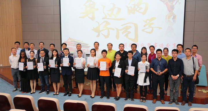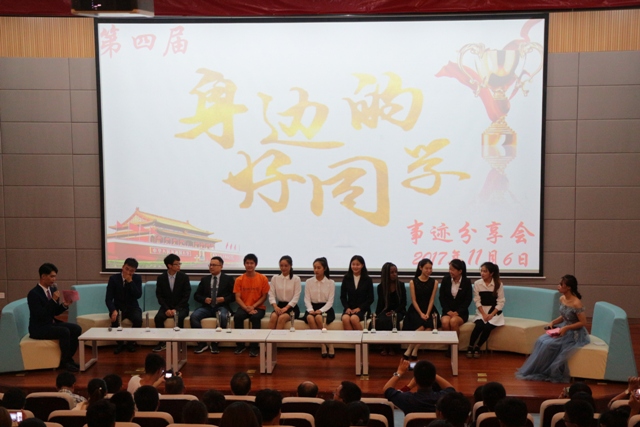 “身边的好同学”获奖者们从各自辅导员或学院老师手里接过沉甸甸的奖杯,并在舞台中央与老师合影留念,快门的咔嚓声为他们记录下了这一辉煌的时刻。颁奖典礼结束后,本届才艺之星洪俊平为在场观众们带来了妙趣横生的街舞表演。随后,在同学们的簇拥下,身边好同学们围坐在舞台中央。夏小丽同学分享了自己十五个月学习汉语的方法与技巧;在被问到创业相关问题时陈斌同学鼓励大家想创业就大胆的去做;阿尼玛卿登山队则讲述了他们登山的艰苦历程,在一次攀雪山的过程中因为冰川裂缝等客观原因放弃登顶;洪俊平同学说道大一时自己还是个舞蹈新手,但是在刻苦训练下终于有所回报。在场所有的获评人都和同学、老师们,分享了自己追梦路上的有趣故事以及心路历程。