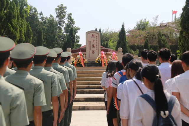中午1:00,全体师生抵达烈士陵园。在烈士陵园,全场师生肃立,庄严吟唱中华人民共和国国歌。曲毕,国防生脱帽向烈士行三鞠躬礼,众师生默哀一分钟,以表达对烈士们为争取民族自由和人民幸福而英勇献身的革命精神的崇高敬意。此后,国防生献上花圈,学生组织代表整理挽联。仪式最后,全体师生瞻仰烈士纪念碑,并绕烈士墓一圈,深切缅怀烈士们的革命功绩。饮水思源,整个仪式过程沉静而庄重,全体师生深刻感受到了革命烈士的庄严气息。