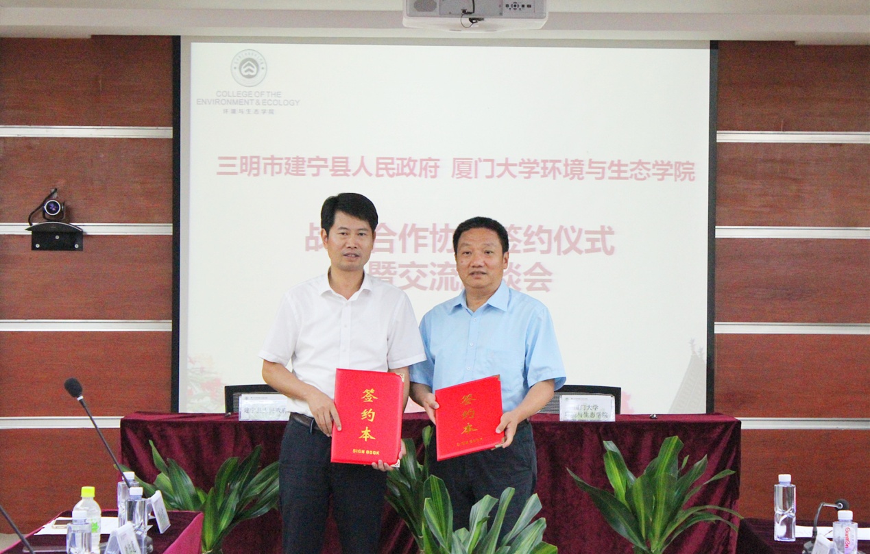 9月18日上午,学院与建宁县人民政府战略合作协议签约仪式暨交流座谈会在厦门大学翔安校区金泉楼A239会议室举行,会议由学院曹文志副院长主持。建宁县委书记郑剑波和学院党委书记沈小平分别致辞,陈华伟常务副县长及曹文志副院长作为双方代表上台签约。此外,建宁县长陈显卿、县常委、副县长陈华伟、副县长牛弋及建宁县发改局、商务局等部门领导;环境与生态学院党委副书记许美霞、系主任王新红、黄凌风以及生态文明培训中心、研发中心、工程中心等平台负责人参加并见证了签约仪式,随后双方展开了深入座谈。