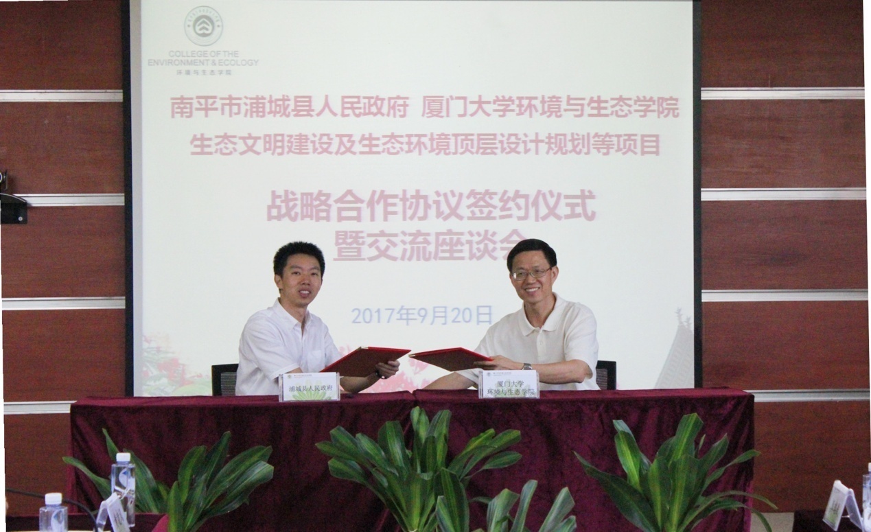 9月20日上午,环境与生态学院与浦城县人民政府关于浦城县生态文明建设及生态环境顶层设计规划等项目战略合作框架协议签约仪式在金泉楼A239会议室举行。会议由曹文志副院长主持,浦城县长沈晓文和学院院长李庆顺分别致辞;沈晓文县长及李庆顺院长作为双方代表上台签约。此外,浦城县发展改革和科技局、规划建设和旅游局、环保局、商务局等相关部门领导;环境与生态学院党委书记沈小平、副书记周克夫、系主任王新红、黄凌风及生态文明培训中心、环境安全与生态健康检测中心、研发中心、工程中心等平台负责人并见证了签约仪式。