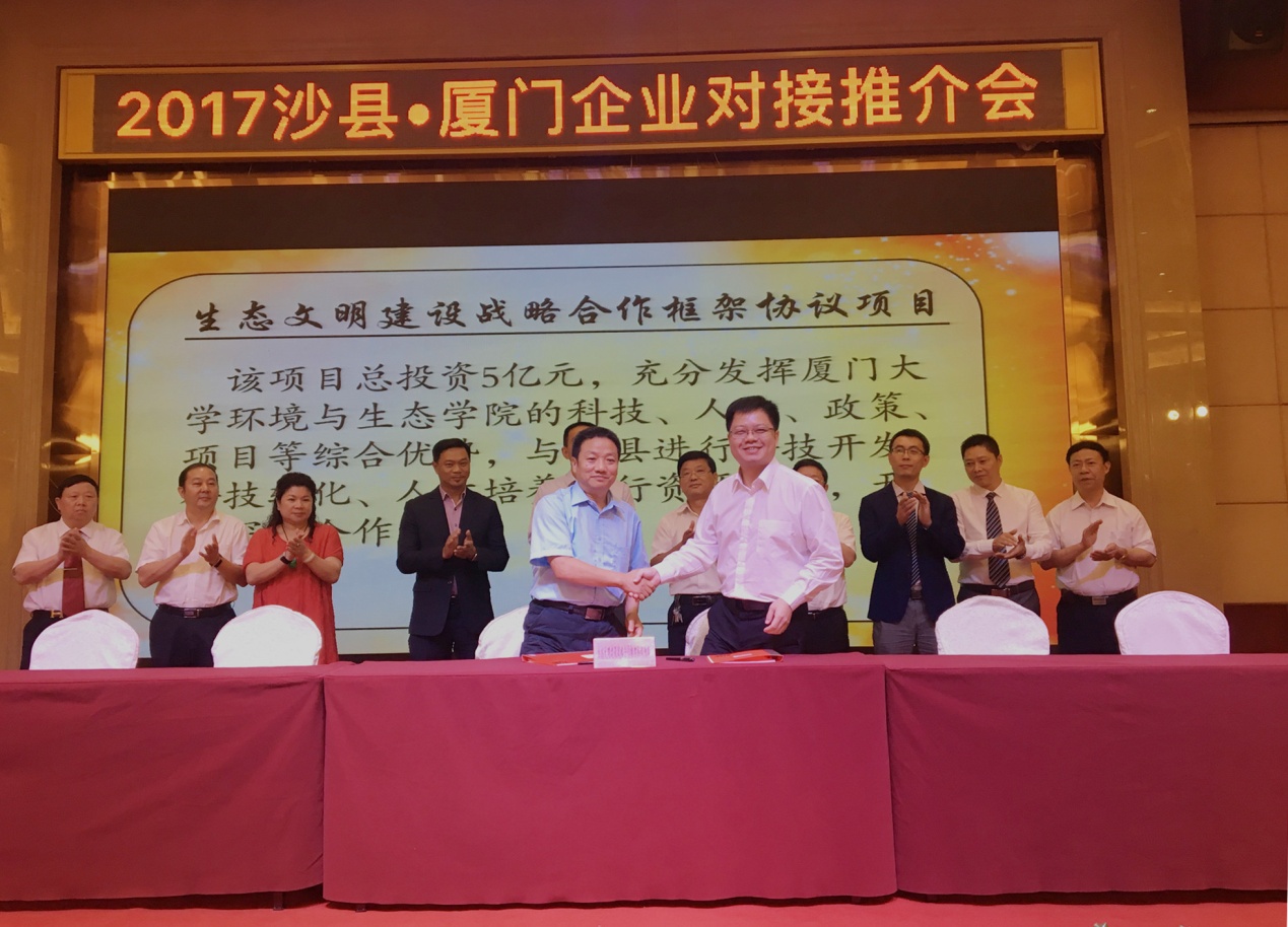 9月18日下午, 2017年沙县·厦门企业对接推介会作为2017厦门国际投资贸易洽谈会的分会场在厦门闽南大酒店召开,会上举行了学院与沙县人民政府关于生态文明建设战略合作框架协议签约仪式。沙县人大常委会主任余荣生、副县长卓强、海西三明生态工贸区、三明高新区各管委会及沙县相关业务局领导;环境与生态学院党委书记沈小平、副院长曹文志、工会主席、公共仪器平台中心主任杨盛昌、院长助理李杨帆等出席了仪式。卓强副县长和曹文志副院长分别作为双方代表上台签约。