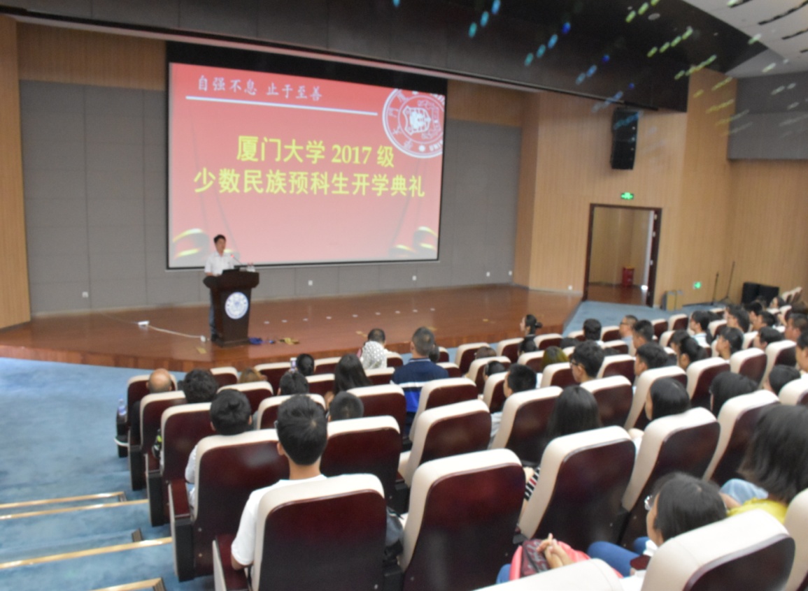 9月11日上午,厦门大学2017级少数民族预科生开学典礼在翔安校区图书馆2号报告厅举行。来自全国各地的69名少数民族预科新生及家长参加了开学典礼。学生工作处处长夏侯建兵、翔安学生办主任兼学生工作处副处长张清榕、少数民族预科生管理中心团委书记兼辅导员于正伟、教学秘书吴晨恩等出席仪式。仪式由张清榕主持。