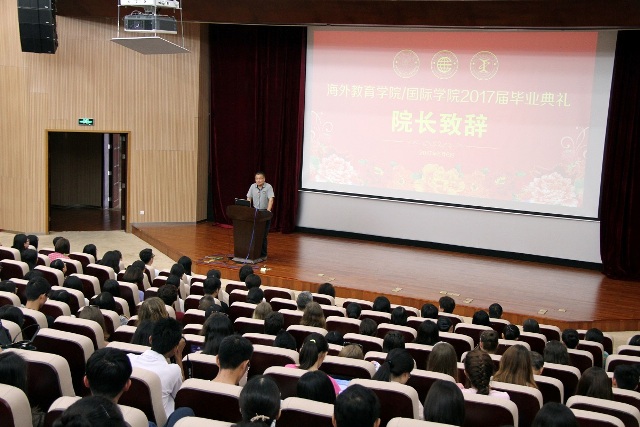 郑通涛院长首先致辞。本学年,海外教育学院/国际学院共有一千多学生毕业,走向职场或继续深造。其中,海外教育学院的来华留学生毕业后将奔赴世界各地开始自己的新征程,国际学院毕业生中也有大部分学生即将奔赴全球53所国外高校留学,这些毕业生都将成为中外交流的桥梁。郑院长对大家顺利完成学业表示了祝贺,并对大家提出了殷切的期望和要求。他说“当你们真正走上社会之后,会慢慢发现学生时代的感情是最真挚的。”郑院长希望大家珍惜在校学习生活期间的师生之情、同学之情。他也要求全体同学离开母校之后要继续发扬学院的优良传统,牢记“自强不息,止于至善”的校训,追求极致,奋勇前行。同时,他也期待同学们能够不忘母校,常回家看看!