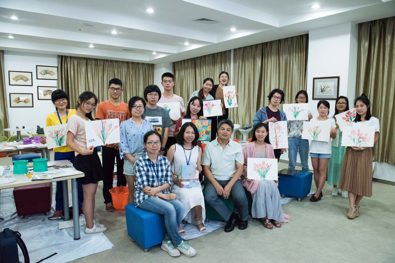活动伊始,黄老师先介绍了自己的学画经历以及个人艺术创作风格的过程。然后通过了大量绘画作品的展示,向同学们介绍了油画创作与水彩画创作的不同之处,指出艺术创作的关键点之一是要实现色彩与结构的双平衡。紧接着黄老师通过一些具体案例,向同学们展示了色彩对人们心理的影响,让大家领略到色彩运用的奇妙。同时黄老师还强调,虽然艺术创开始于感性的灵感,但是画笔必须落纸于理性的控制,画面中的一枝一叶都需要经过缜密的考虑。听完黄老师的讲解,同学们拿起画笔,兴致勃勃的临摹黄老师的作品,亲身体验绘画的乐趣。虽然大部分同学并未学过绘画, 但在黄老师的指导下,大家都顺利完成了自己的作品。