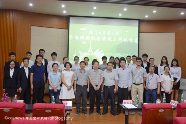 5月13日下午,厦门大学第三届大学生节能减排社会实践与科技竞赛在翔安校区落下帷幕。本届竞赛由校团委、教务处、环境与生态学院联合主办,环境与生态学院团委承办,厦门市节能监察中心协办。决赛共有15支队伍,是由环境与生态学院,化学化工学院,能源学院和材料学院组成的5支社会实践队和10支科技队参加终审答辩。厦门市节能监察中心主任官义高,环境与生态学院周克夫、黄晓佳,能源学院曾宪海、郑淞生,材料学院曹福勇六位老师担任评委。厦门大学翔安校区团委林文勤,能源学院党委副书记缪惠芳、能源学院团委书记龚树丰,环境与生态学院团委副书记毛勇和院辅导员张璐婧出席了活动。
