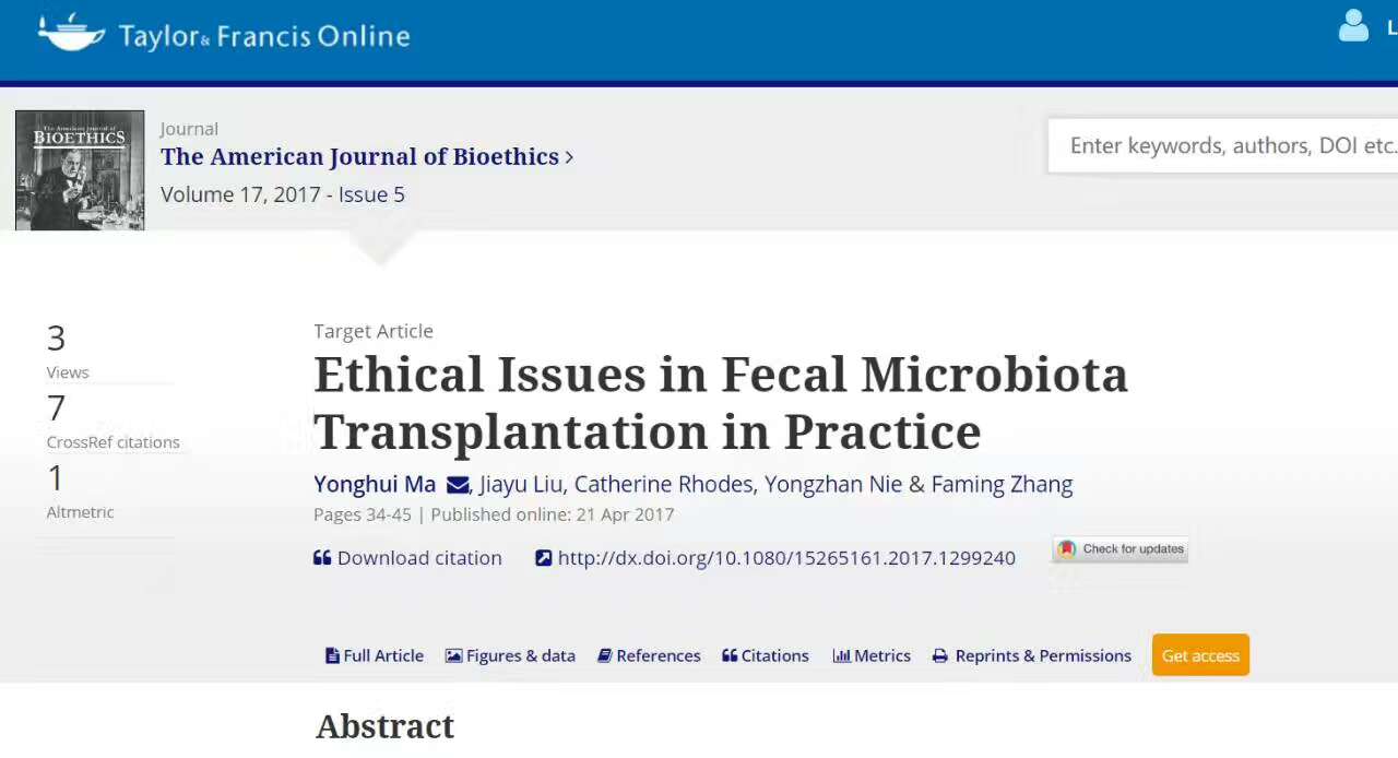 近日,伦理学领域国际影响因子最高(SCI&SSCI IF:6.5)、最权威的顶级期刊《美国生命伦理学杂志》(American Journal of Bioethics) 以主题论文(Target Article)正式刊出了厦门大学医学院青年教师马永慧(第一作者兼通讯作者)及其合作者的长篇论文“Ethical Issues in Fecal Microbiota Transplantation in Practice”。该文是《美国生命伦理学杂志》自创刊以来首次刊登来自中国大陆学者的学术论文,对于国内生命伦理学、医学伦理学界具有重大突破意义。