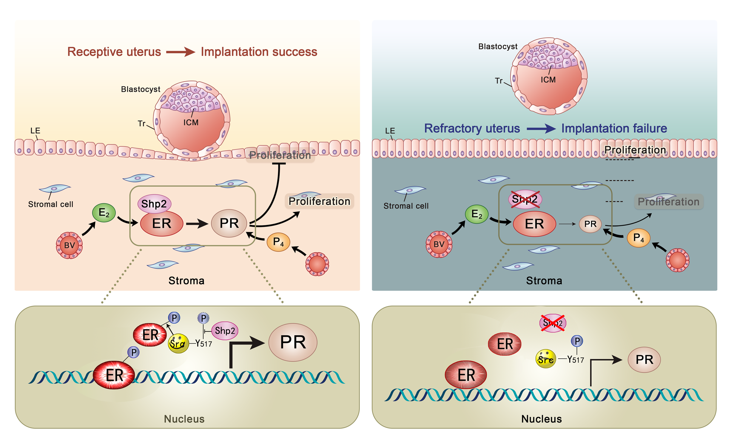 王海滨教授率领的生殖调控团队利用动物胚胎植入模型和转基因模式动物,最近发现一个关键的调控蛋白-酪氨酸磷酸酶Shp2,将它在子宫内膜细胞中特异敲除,可造成胚胎植入完全失败,雌性小鼠不育;机制研究发现,缺失Shp2阻断了子宫内膜基质细胞中的雌激素信号活性。进一步研究发现,Shp2并不像在其他细胞中主要定位于细胞质发挥功能,而是需要进入细胞核中结合雌激素受体,募集并调控Src信号蛋白对雌激素受体(ER)的活化,最终影响雌激素受体靶蛋白的转录,其中包括对子宫接受态建立关键的孕激素受体(PR)的表达调控。