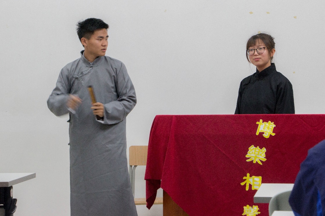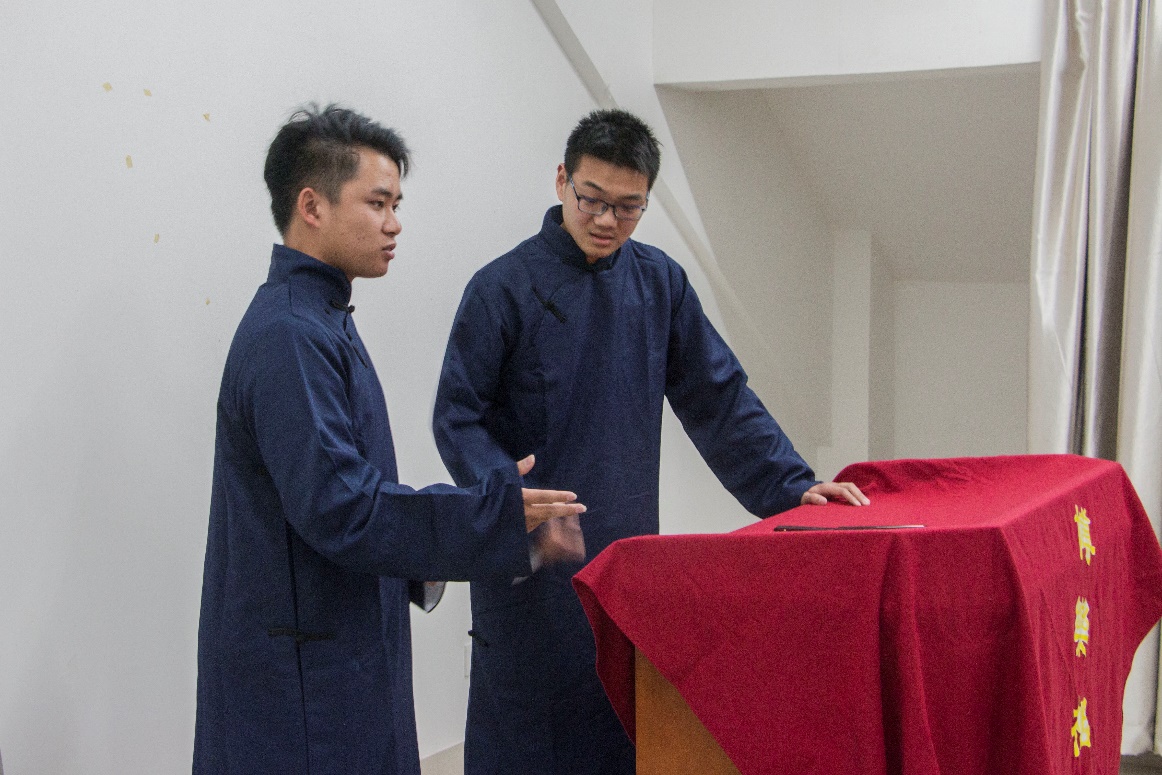 同学们抛去怯场的青涩,换上干练的姿态,一句句看似简单的话语,都有幕后千百次对人物的体会揣摩和训练。且不说把话说得流畅顺遂就是一门功夫,如何做到在诙谐中体现一个人物的特点和深刻的情感就更是一门很深的学问。智慧很难,幽默很难,那在幽默中处处体现智慧便是难上加难。作为一个与你我同龄的年轻人,细细揣摩着跟自己的前途未来专业毫不相干的传统相声艺术,博乐相声社的所有成员需要的不仅是激情,更是一份褪去浮华的坚持与热爱。