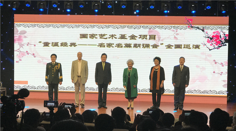 随着经典片段的播放,朗诵会拉开序幕,六位60岁以上的国家级艺术家分别朗诵诗经、楚辞、汉赋、唐诗、宋词、元曲的选段,那些脍炙人口的经典名句将观众带入了诗的意境。紧接着响起歌曲《临江仙 滚滚长江东逝水》的前奏,著名歌唱家孙禹浑厚的嗓音和气势磅礴的演唱将气氛推向高潮,现场掌声雷动。