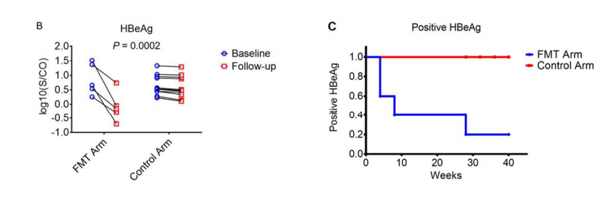 对于HBeAg阳性慢性乙型肝炎(慢乙肝)患者而言,HBeAg血清学转换是重要的治疗目标,也是停药的先决条件之一。但核苷(酸)类似物治疗时,仅有少部分患者可实现HBeAg清除或血清学转换率。随着对肠-肝轴认识的深入,人们已发现肠道微生物在慢性肝病的发生发展中都扮演了一定角色。从这个角度出发,该研究设计了一项病例对照、开放标签的前导性研究,探索了粪菌移植(Fecal microbiota Transplantation,FMT)在长期NA治疗后HBeAg仍未转阴的慢乙肝患者中的治疗价值。研究纳入了18例经恩替卡韦或替诺福韦治疗3年以上但仍未实现HBsAg消失的慢乙肝患者。患者在继续接受抗病毒治疗的同时,其中5例接受了FMT,13例作为对照。FMT治疗组患者接受经胃镜FMT治疗,每4周一次,直到HBeAg消失。4例患者接受了1~7次治疗,1例患者在第5次FMT治疗后退出了试验。随访结束时,FMT组患者的HBeAg滴度较基线水平有显著下降,并且是在每次FMT治疗后逐步下降。2例患者在接受了1次FMT后即实现HBeAg清除,还有1例在2次FMT治疗后清除HBeAg。相反,对照组没有一例患者清除HBeAg。两组比较P值为0.0001。随访结束时未观察到HBeag血清学转换。研究中未见严重不良事件。