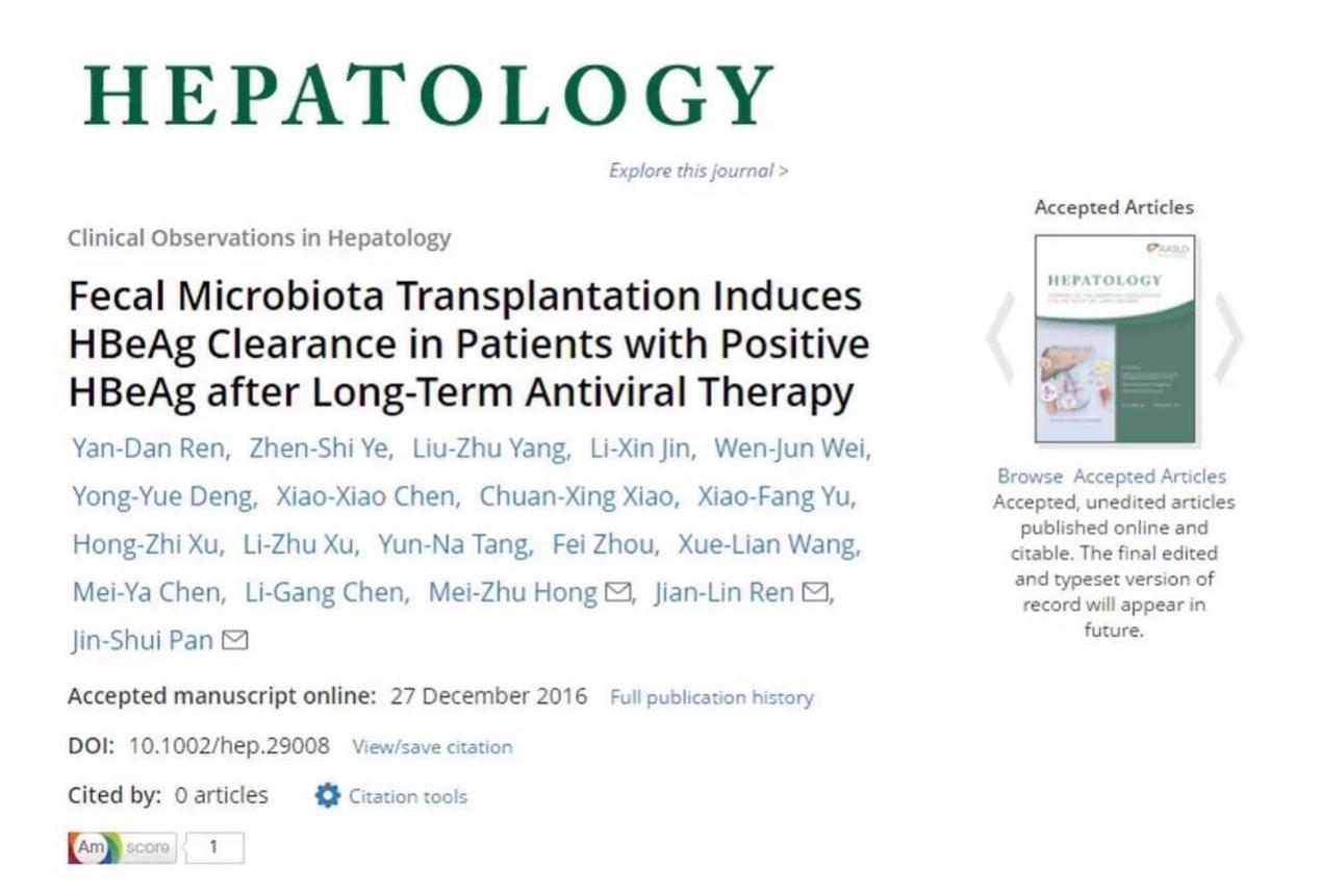 12月27日,厦门大学附属中山医院消化内科任建林、潘金水团队领衔完成的粪菌移植治疗慢性乙型肝炎研究在线发表于国际肝病领域顶级期刊《Hepatology》,并且被遴选为封面文章。《Hepatology》是美国肝病研究学会会刊,影响因子达11.711分。据悉,该研究是福建省卫生领域首个由独立单位完成被《Hepatology》期刊接收的研究。