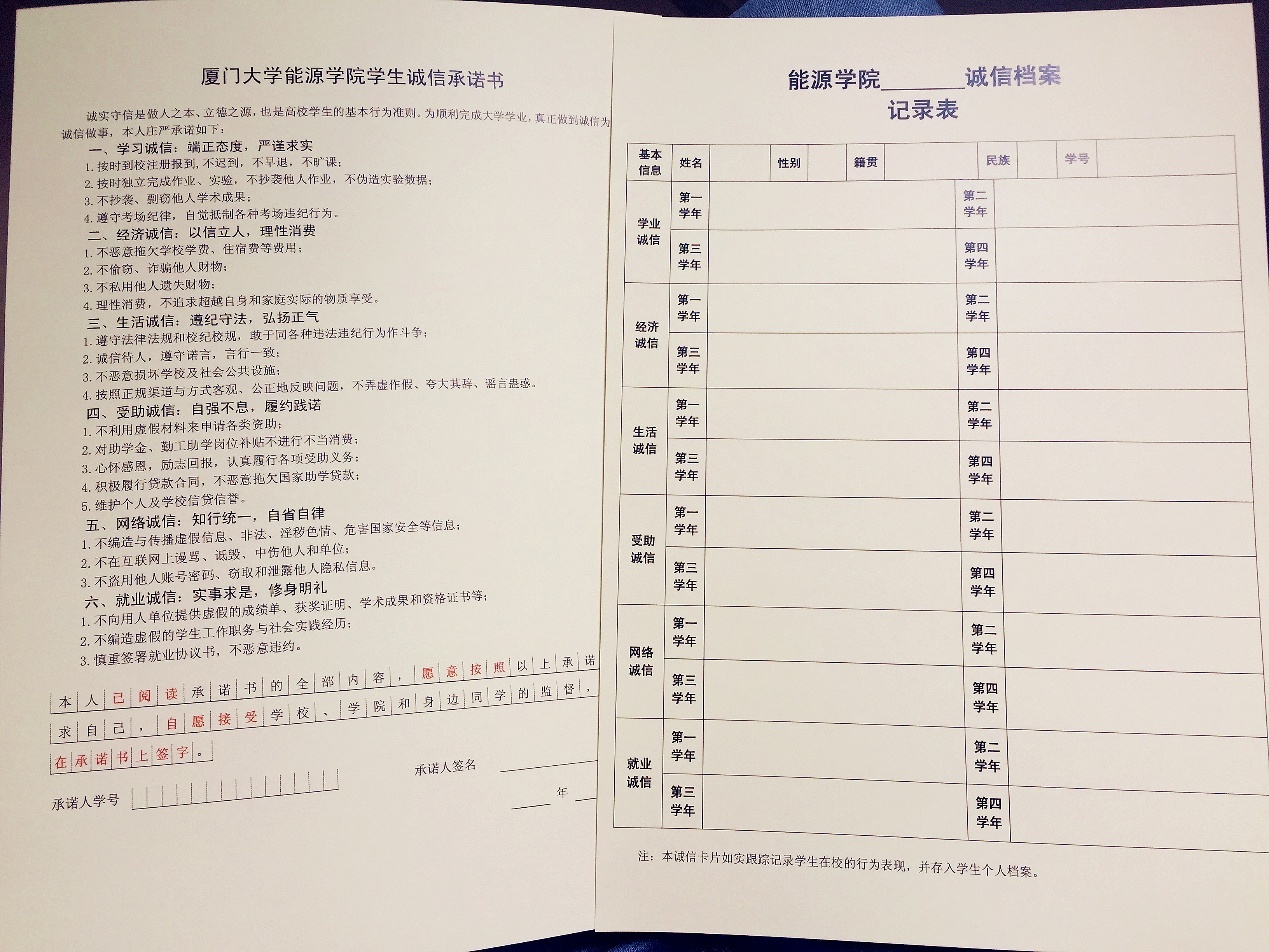 能源学院还根据诚信承诺书的六个方面,为全院学生建立了诚信档案,学生在校期间的优异表现和失信行为都将被记录在诚信档案里。毕业后档案锁定,随个人就业流转到用人单位,学生失信行为将影响个人以后求职、交友、信贷等领域。