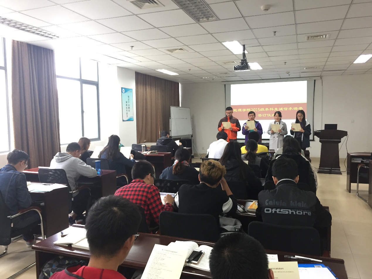 期末考试即将来临之际,为切实落实学校、学院提出的加强学风建设,严肃考风考纪,倡导以诚信考试为荣,以作弊违纪为耻的优良考风,引导学生实实在在做人,认认真真治学,树立诚信考试的良好学风,12月27日至28日,能源学院党委副书记马兆海、缪惠芳老师与学院辅导员对全体本科生、研究生开展了考试诚信教育,并组织学生签订了诚信承诺书、建立了能源学院学生诚信档案,这也是能源学院这本学年学风建设工作的重要一环。