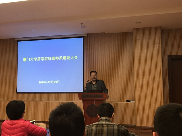 团委书记陈国全向教师们介绍了师德师风和学风建设的具体做法和要求,并组织大家学习了《厦门大学药学院本科生日常管理条例(试行)》、《厦门大学药学院本科生考试管理办法(试行)》、《厦门大学药学院课堂教学管理规范(试行) 》等相关行为规范文件,对如何紧抓课堂考勤、严肃考风考纪等,提出了一些具体有效的做法供大家探讨、学习。