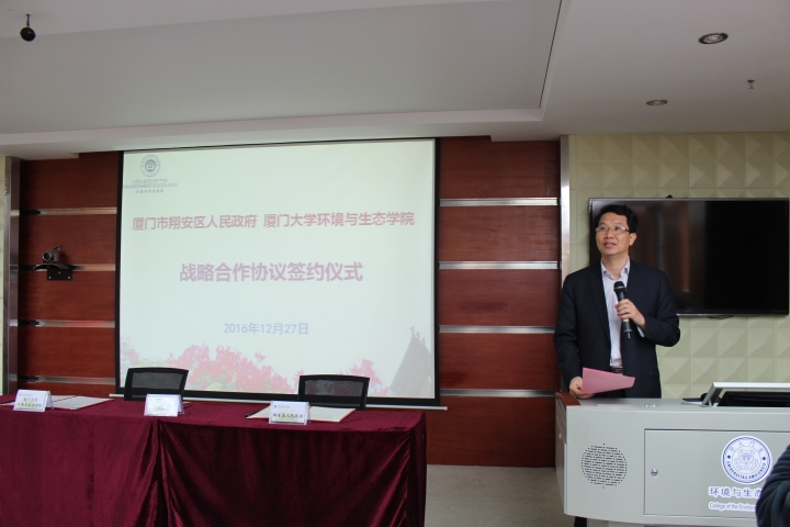 为推动厦门市生态文明建设,深化高校-政府-企业产、学、研的深度融合,促进厦门大学与翔安区人民政府之间的合作与交流,12月27日上午,厦门大学环境与生态学院与厦门市翔安区人民政府战略合作协议签约仪式在环境与生态学院A239会议室举行。