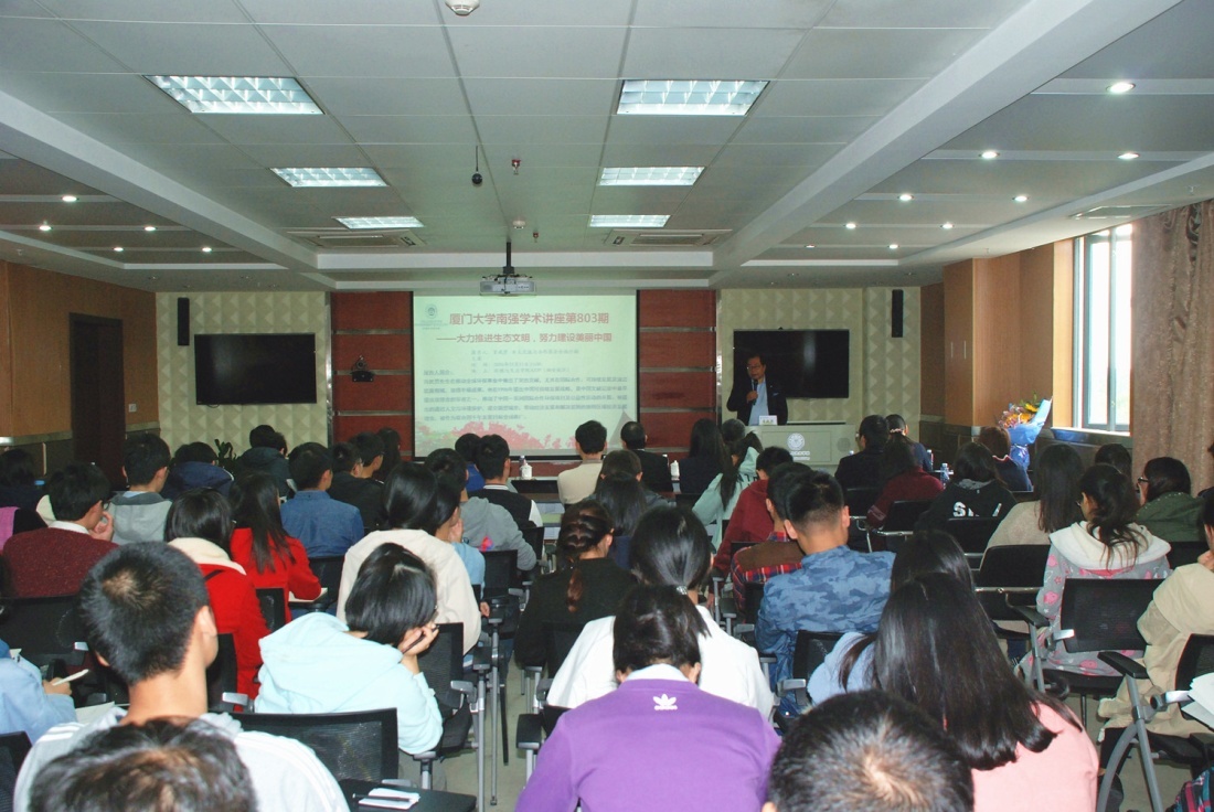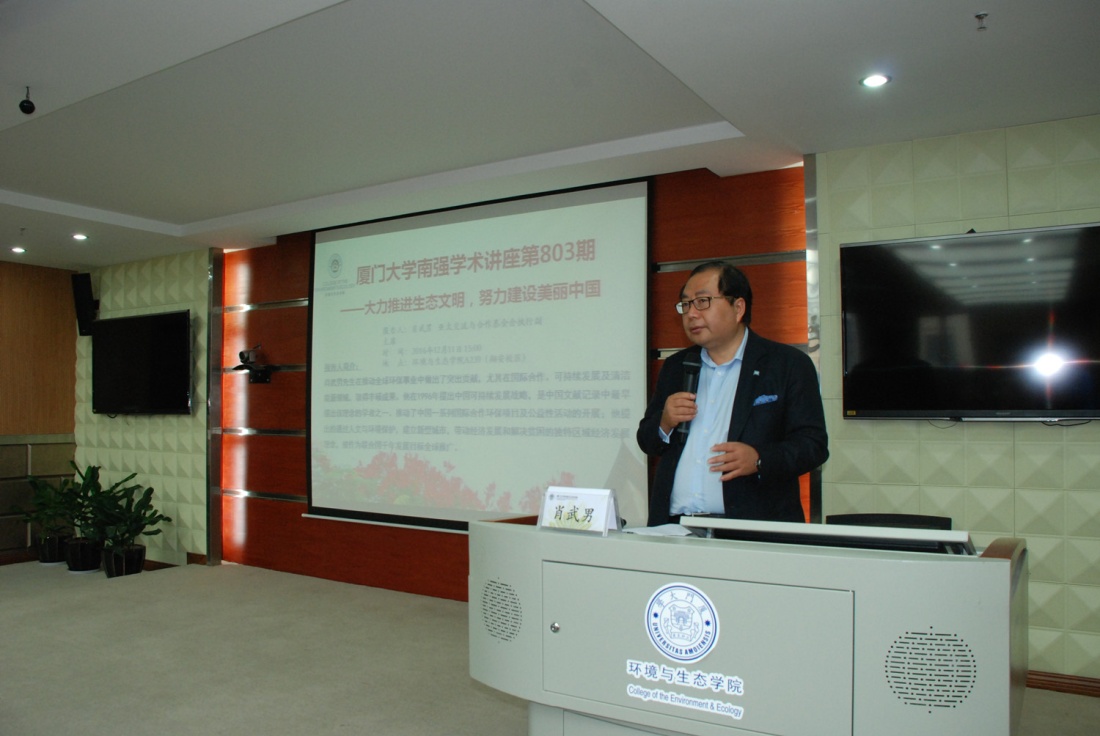 2016年12月11日下午,亚太交流与合作基金会执行副主席肖武男先生受环境与生态学院邀请,做客我校南强学术讲座。肖武男副主席此次带来的讲座题为“大力推进生态文明,努力建设美丽中国”,为我校南强学术讲座第803讲。