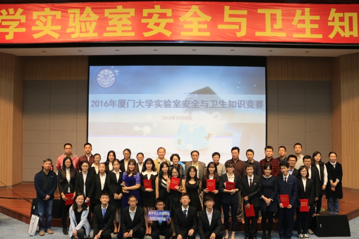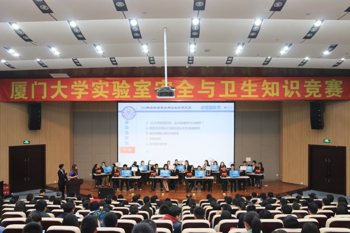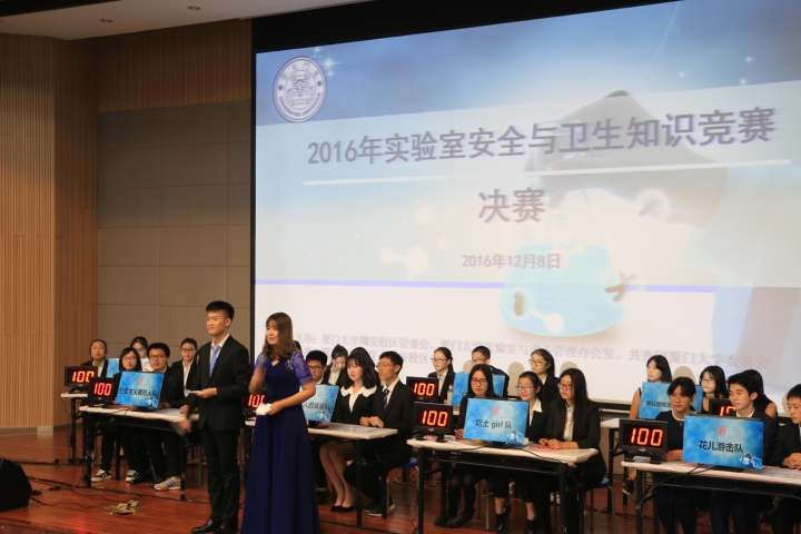 12月8日晚,厦门大学2016年实验室安全与卫生知识竞赛决赛在德旺图书馆小报告厅顺利举办。厦门大学实验室与设备管理办公室副主任陈晓兰,化学化工学院教授、基础化学实验课程组组长杨士烑,化学化工学院教授、厦门市安全生产专家委员会安全生产专家、危化品副组长、福建省危险化学品安全生产管理专家(危化品组)、校实验室安全督导汤培平,原现代教育技术与实践训练中心副主任、校实验室安全督导洪璇玲,厦门大学团委副书记、翔安校区团工委书记洪海松担任决赛评委。中国科学院院士、副校长韩家淮,翔安校区管委会各有关部门,各学院团委、辅导员及300余名学生参加本次活动。