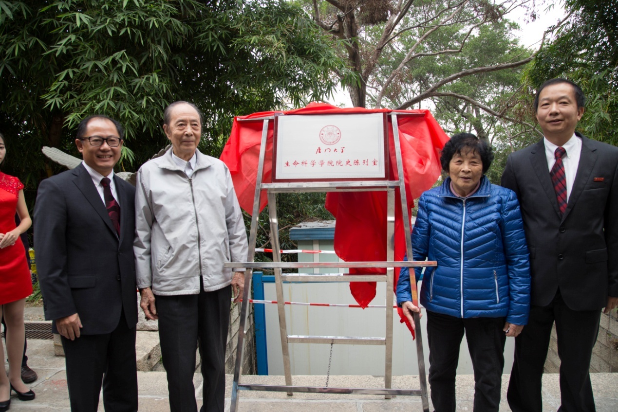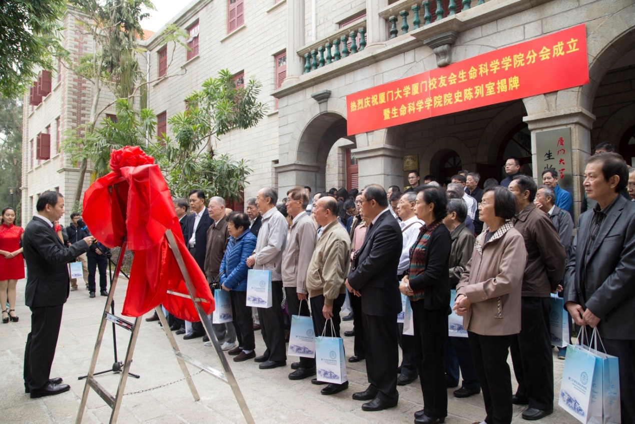当天上午,在厦门大学厦门校友会生命科学学院分会成立大会召开之前,生命科学学院在成义楼(生物一馆)前举行了院史陈列室揭牌仪式。仪式由学院党委副书记张伟主持。陈光书记在致辞中指出,学院94年的办学历程,凝练形成了追求世界一流的学院文化。学院致力于研究世界一流科学的同时,也培养出以8位两院院士为代表的一流科学家。他希望以院史陈列室的建成为契机,进一步加强学院文化建设,努力构筑厦大生科人共同的精神家园,进一步提升广大校友对学院的归属感和认同感,为推动学院发展出谋划策、增添力量。随后,唐崇惕院士、陈光书记、曾定教授、翁师德校友共同为院史陈列室揭牌。揭牌仪式后,参会领导、嘉宾、校友们参观了院史陈列室和厦大生物博物馆。