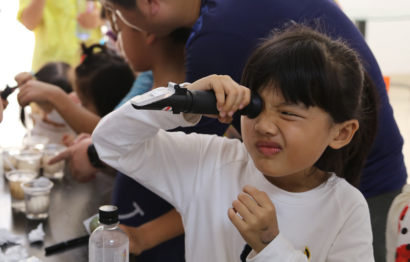 孩子们可以参与简单的实验,区别海水和自来水的酸碱度、盐度,识别水体富营养化与污染,学习液氮的知识、了解碳汇的故事、模拟加速的海洋酸化现象、用显微镜在沉积物中寻找有孔虫和古气候的痕迹。