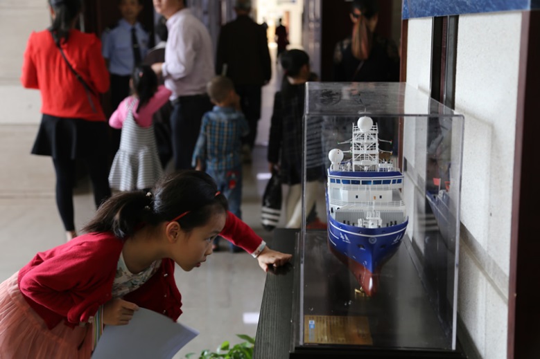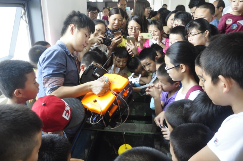 在开放日现场,“嘉庚号”科学考察船模型备受关注,各类浮标、潜标、卫星遥感技术、水下机器人等高新技术一一展现在公众面前,工作人员通过浮力小魔术介绍浮标工作原理、用模型演示海洋内波现象;无人机3D体验站还带领参与者跟随无人机鸟瞰滨海湿地世界,同时呈现台风“莫兰蒂”展示给翔安校区的影响。