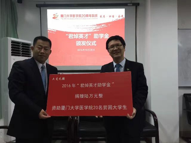 10月30日上午,医学院“君焯英才助学金”颁发仪式在厦大医院会议室举行。“君焯英才”捐助方香港君焯医疗管理顾问有限公司董事长尹卫民博士、助理肖鹏先生、医学院党委副书记马龙、团委副书记陈国渊、辅导员邱超超及全体受资助学生参加了仪式。