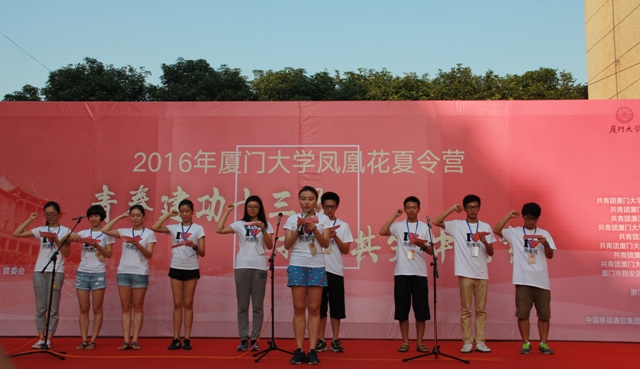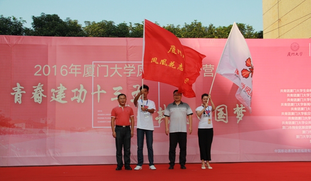 珩厝小学凤凰花夏令营开营仪式由带队老师刘慧主持。郭闻文副书记讲话并宣布2016年厦门大学凤凰花夏令营开营。林佳跃局长和高忠华副书记共同为凤凰花夏令营授旗。
