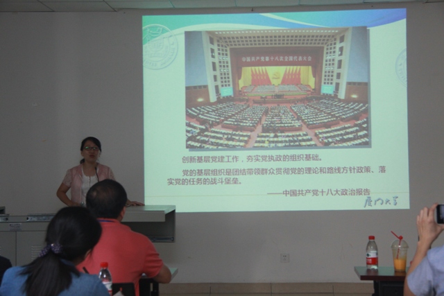 党课伊始,廖志丹运用诙谐幽默的语言,循循善诱,以生科院及校内党建工作的丰富实例,向大家讲述了党建工作“做什么”、“如何做”,引发了大家浓厚的兴趣。在大量生动的案例中,她强调了在党建工作不仅要注重创新,抓好细节,在重视宣传的同时,要防止“精致的形式主义”。