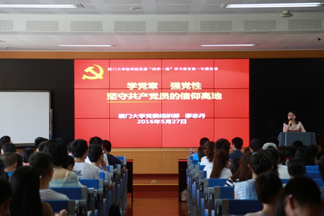 为扎实推进“两学一做”学习教育,5月27日,医学院党委邀请校党委组织部副部长廖志丹在翔安校区模拟医院报告厅讲授了题为《学党章,强党性,坚守共产党党员的信仰高地》的专题党课。院领导班子成员、各系部中心负责人、全体师生党员及部分学生入党积极分子参加了本次党课学习。院党委副书记马龙主持本次党课。