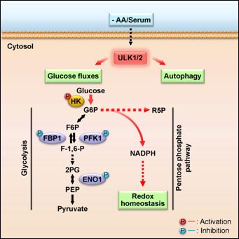 过三年多的技术攻关,该研究小组发现,在氨基酸或血清缺乏的情况下,自噬启动激酶ULK1可以直接地磷酸化葡萄糖代谢通路中的多个关键酶,包括糖酵解途径中的己糖激酶(HK)、磷酸果糖激酶(PFK1)、烯醇化酶(ENO1)以及糖异生途径中的果糖-1,6-二磷酸酶(FBP1),这些酶被ULK1磷酸化修饰后,它们的酶催化活力可以发生不同程度的改变,即促进了HK的活性以及抑制了PFK1、ENO1和FBP1的活力。研究表明,这些酶在活力上的变化不仅可以最大限度地维持应激状态下的糖酵解速率,也可以使更高比例的糖代谢中间产物葡萄糖-6-磷酸(G6P)流向磷酸戊糖途径(PPP),从而在整体上维持细胞内的能量与氧化还原稳态。更进一步的研究发现,ULK1在葡萄糖代谢通路上的调控作用,是一种不依赖于其在经典的自噬方面的新功能。