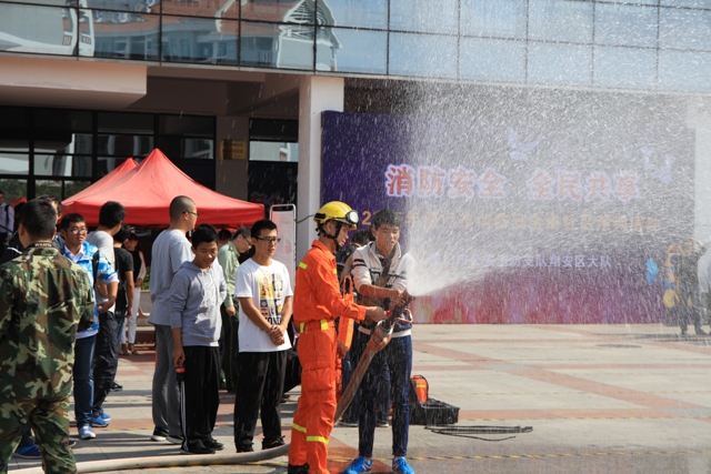 中午11时30分,体验活动正式开始。本次宣传活动安排了大量的互动节目,包括消防云梯体验、逃生结绳教学、特勤装备展示、消防衣着装体验和高压水枪喷射操作体验等。现场师生踊跃参与体验项目,云梯车等体验项目排队等候队伍始终络绎不绝,新店中队官兵精彩的表演和生动的解说获得此起彼伏的掌声和欢呼声。