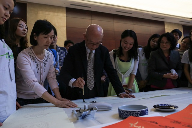 开幕式现场,书法爱好者与吴紫栋先生及嘉宾积极互动,更有幸运者现场拿到吴老先生墨宝。来自生命科学学院的黄同学表示,很喜欢吴老先生的字,也很高兴在翔安校区也有如此人文气息的展览。本次展览也吸引很多留学生前来,来自英国的玫瑰同学说自己不仅领略到汉字的独特魅力,也学习到更多的中国传统文化。