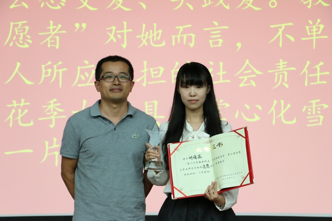 她用时间播种爱,她用爱润泽寰宇。她是厦门大学爱心社翔安校区分社社长,她是国际学院青协会长,她是“爱溪实践队”支教队队长。她“以爱之名”去付出、去奉献,去感受爱、实践爱。教在于外力,养在于人心。“志愿者”对她而言,不单是一个称号或荣誉,更是一个人所应承担的社会责任。温柔而坚定,刘晓菡——这个花季女孩具有掌心化雪的力量,心中四季长春,芬芳一片。