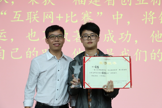 实践之星——尚策。他是厦门鹭飞儿信息科技有限公司原始创建人之一,目前担任公司副总经理兼财务总监。他感恩母校,在厦大开设了鹭飞电子医院,为全校师生的电子产品提供免费维修服务。