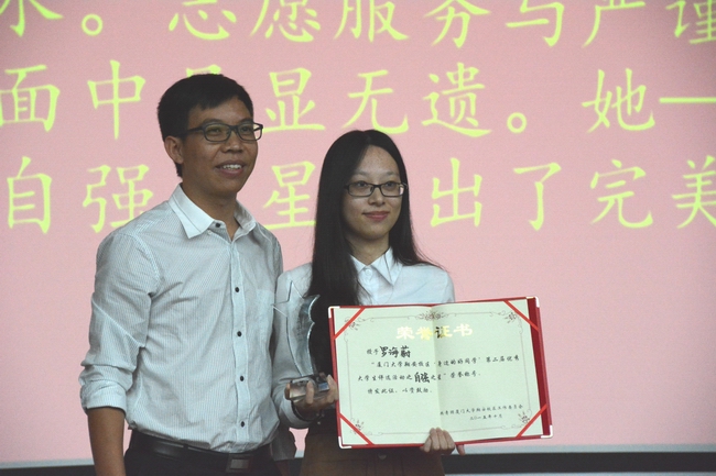 自强之星——罗海蔚,她身体困于先天性遗传疾病,娇小柔弱,从小忍受着别人异样的目光,她用积极向上的心去面对。她上进拼搏,分获两年的国家奖学金与国家励志奖;她服务同学,报效社会,广泛阅读,充实自己,奋斗与拼搏是自始至终的坚定追求。