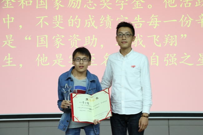 先天性脊柱侧弯未曾弯下他高昂的头颅,巨额的债务未曾压垮他坚实的脊梁。逆风的方向,他飞出了倔强的坚强。多少个日夜的拼搏,让他两年年级排名前十,让他夺下国奖和国家励志奖学金。他活跃在班级活动与各项实践之中,不斐的成绩宣告每一份辛勤都会开出鲜艳的花。他是“国家资助,助我飞翔”全国励志成长成才优秀学生,他是实至名归的自强之星——李少博。