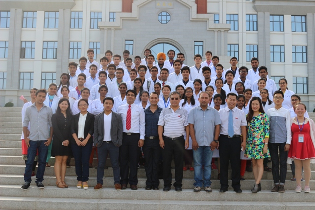 10月23日下午2:00,医学院2015级MBBS(Bachelor of Medicine, Bachelor of Surgery)留学生开学典礼在爱礼楼104隆重举行。60名2015级留学生身穿白大褂,喜气洋洋参加典礼。出席典礼的有医学院副院长齐忠权、院党委副书记马龙、中外教师代表、辅导员、秘书和学生会留学生分会代表。典礼由辅导员程芬老师主持。