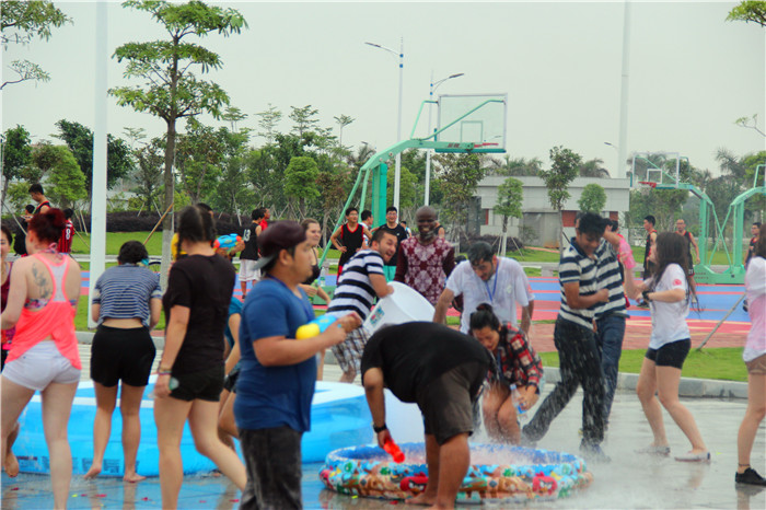 随后,极具泰国风情的泼水节如约在操场举行。在泰国,泼水节代表着清除所有的邪恶、不幸和罪恶,并怀着一切美好和纯净开始新的一年。而此时,拥有不同文化背景的同学们在飞溅的水花中享受着来自异国兄弟姐妹们的祝福。澄澈的水流模糊了文化差异,只留下和谐、共融。