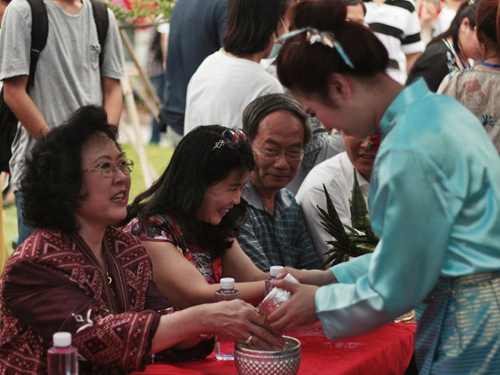 12:30,开幕式正式开始。泰国驻厦门总领事馆副总领事孟坤先生及其夫人,厦门大学南洋研究院泰籍老师许佩璇女士,厦门大学人文学院教授、土耳其中东科技大学孔子学院首任中方院长郑启五,广西师范大学国际文化教育学院党委副书记周飞,厦门大学学生处副处长、翔安校区学生办主任张清榕,海外教育学院/国际学院党委副书记伍伟平,厦门大学团委副书记、翔安校区团工委书记洪海松等领导嘉宾出席了开幕式。孟坤先生在开幕式致辞中提到,此次活动有助于加强中外文化的平等交流,促进双方在文化上,乃至国际事务上的相互理解。他还鼓励留学生们要入乡随俗,积极学习各国文化,融入当地的生活,促进文化交流。