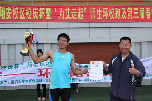 终点处的运动员们或相互祝贺分享过程体验,或补充水分稍作休息,或呼朋引伴拍照留念。待参赛者集结完毕,工作人员宣布了男子前七名和女子前三名,现场欢呼声掌声不断,“运动健儿”高举奖杯,接受着喝彩。而后运动员们还可以进入游戏区参与撕名牌游戏赢游戏奖,这也是“校庆杯”环校跑翔安校区分赛场的特色项目。