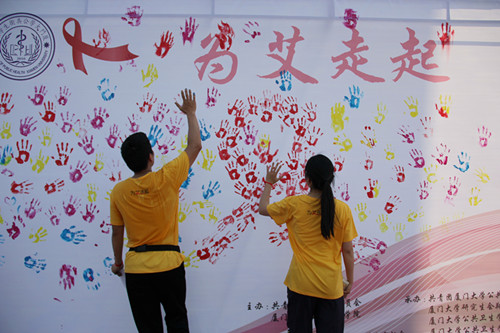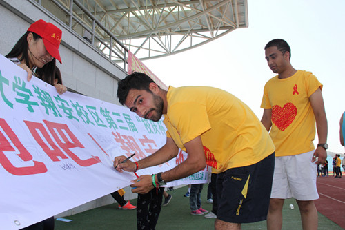 “为艾走起”工作组于途中设置了防“艾”签名点、握手点、抱抱点和手印点,参赛者集齐每个分点的印章便可“召唤神龙”,既增添乐趣,又富有深刻的教育意义。最后,在田径场终点,参与者们的手心刷上了五彩的油墨,在手印墙上印下掌纹,随后在白横幅上留下自己的签名。无论是各个学院的老师、同学,无论是黄种人、白种人、黑种人,大家毫不吝惜热情的握手和拥抱,在环校跑的过程中享受乐趣、相互扶持,现场十分温馨融洽。