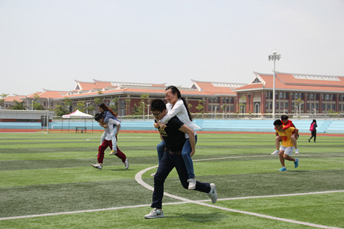“猪八戒背媳妇”这个让人一听就忍俊不禁的项目可不是那么好笑,这是个比拼力量与速度的项目,男生们卯足了劲儿背起女生在草地上飞奔,憋红了脸越过终点还不忘调侃:“想要加速却只感到深深的无力。”激烈的比赛只有在这时才笑得出来。
